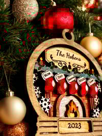 This Christmas family sign represents all the coziness of the holiday season. The sign is shaped like a snowglobe and consists of 3 separate layers, each one adding more items to the Christmas scene. Your sign can have 2-6 stockings and names can be engraved on each. A family name or Merry Christmas can also be engraved above the fireplace and the year on the bottom.